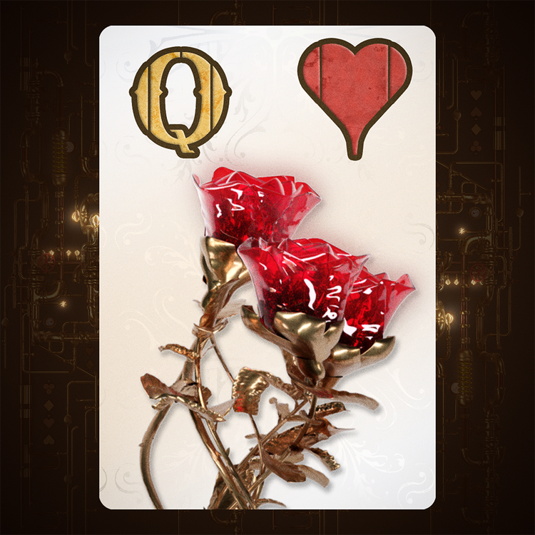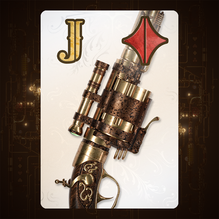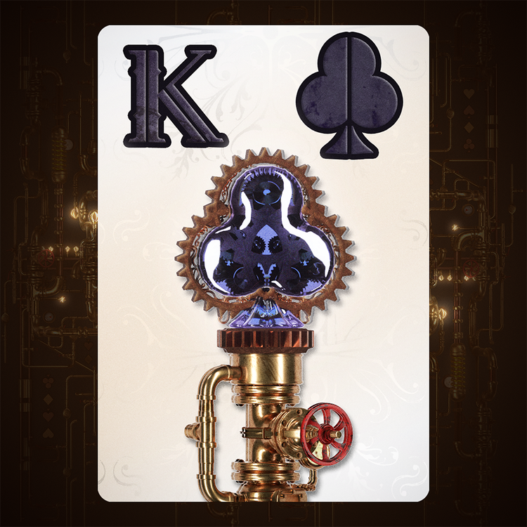 L’univers Steampunk est construit autour d’engrenages, de tuyaux et de détails industriels. Les figures remplacent les personnages traditionnels par des symboles — un sceptre pour le Roi, une rose pour la Reine, un pistolet pour le Valet. Chaque élément a été modélisé et rendu en 3D, puis adapté aux contraintes du format carte digital.