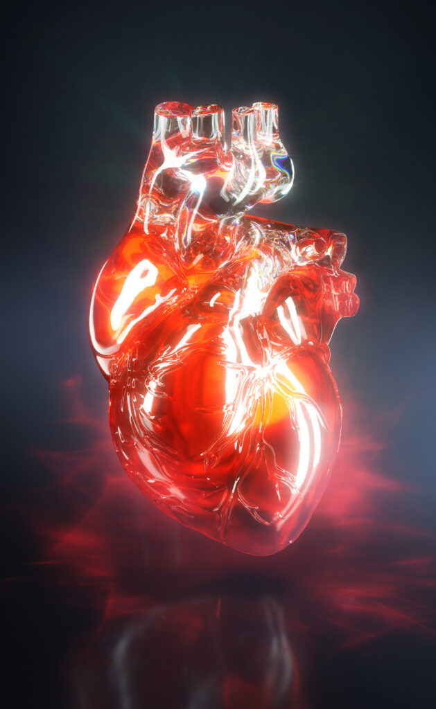 Glass imposed itself naturally. A glass heart is surgical precision made visible — you see inside, you understand the mechanism, without blood, without violence. It is fragile and solid at the same time, like an organ that gets repaired and keeps going for decades.
