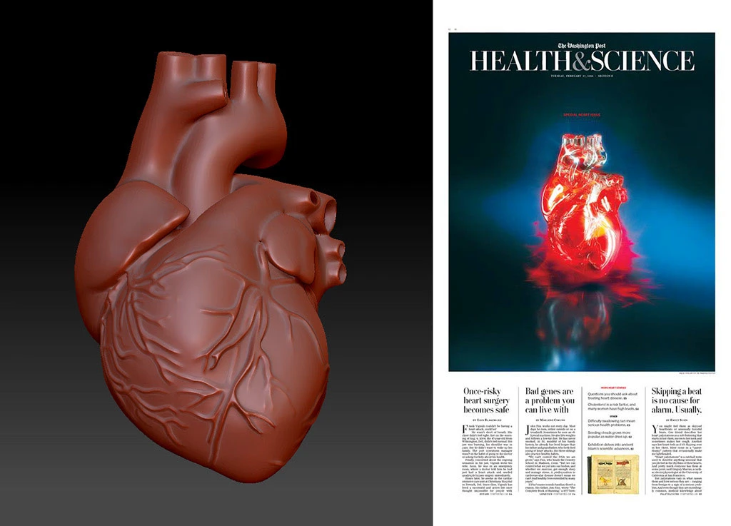 A beautiful heart, not a gory one. Made of glass. Red. Floating. That was essentially the brief received from Alla Dreyvitser, Visual Presentation Director at the Washington Post, for an exceptional commission: the cover of the special Health & Science section, dedicated to heart disease.