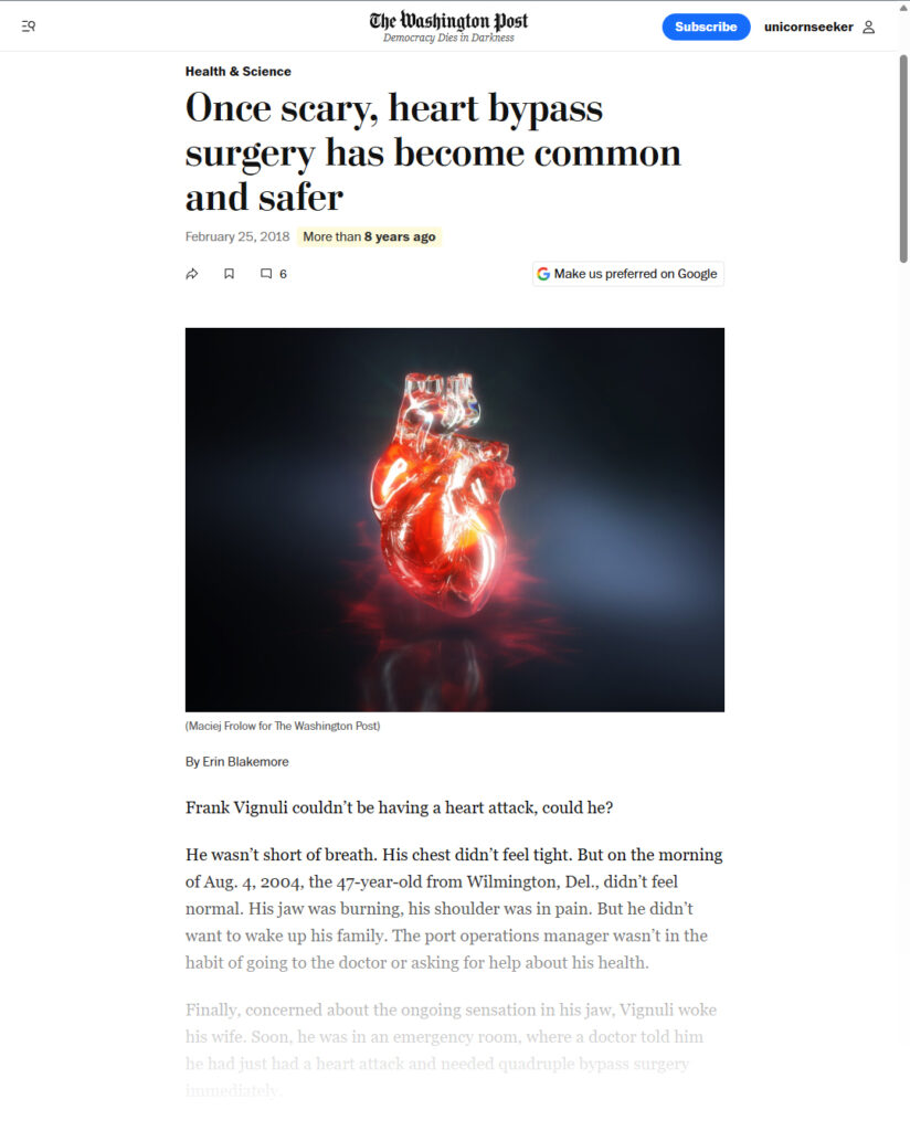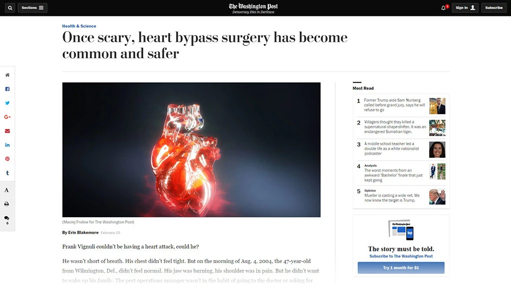 Three weeks of work. An image published on the cover of the Health & Science section of the Washington Post, in February 2018, accompanying articles including “Once scary, heart bypass surgery has become common and safer”.